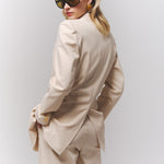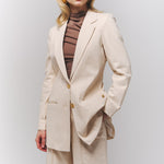 Blazer crudo de silueta alargada, con una estética power tailoring femenino muy marcada.