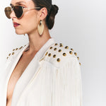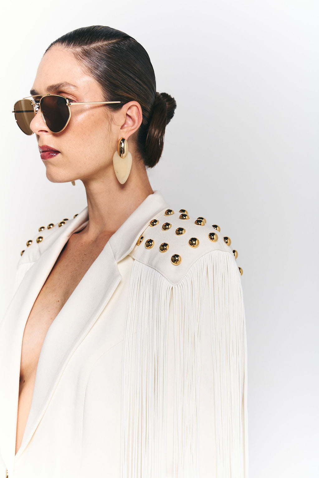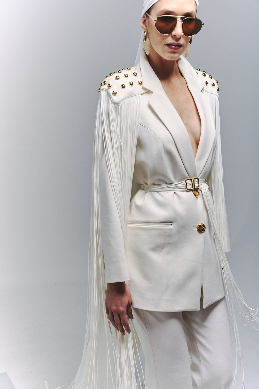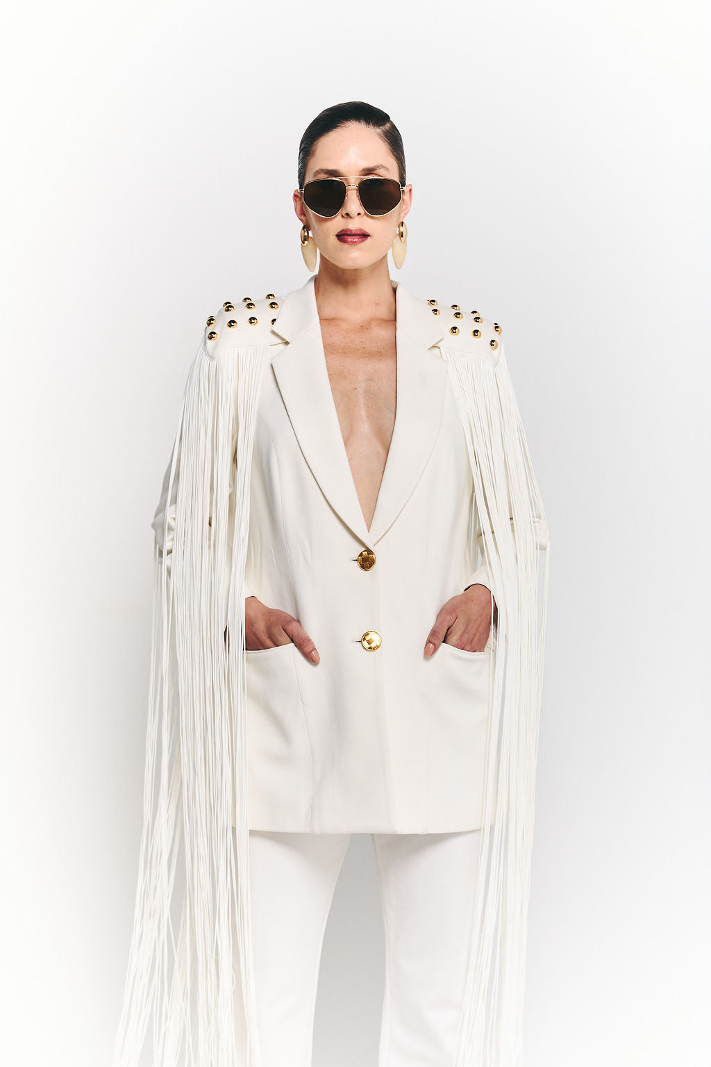De los hombros brotan flecos largos y delicados. Cada hilo cae con intención, transformando el paso en gesto y el gesto en presencia. Al caminar, la prenda respira, vibra, deja huella en el aire.
