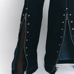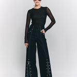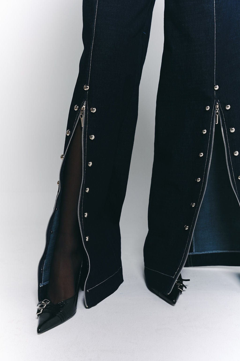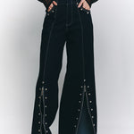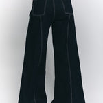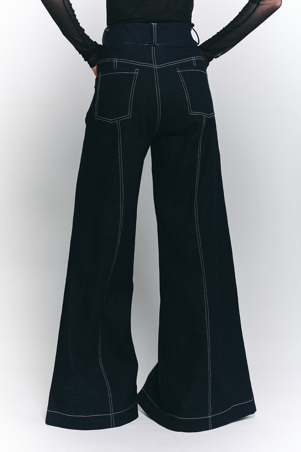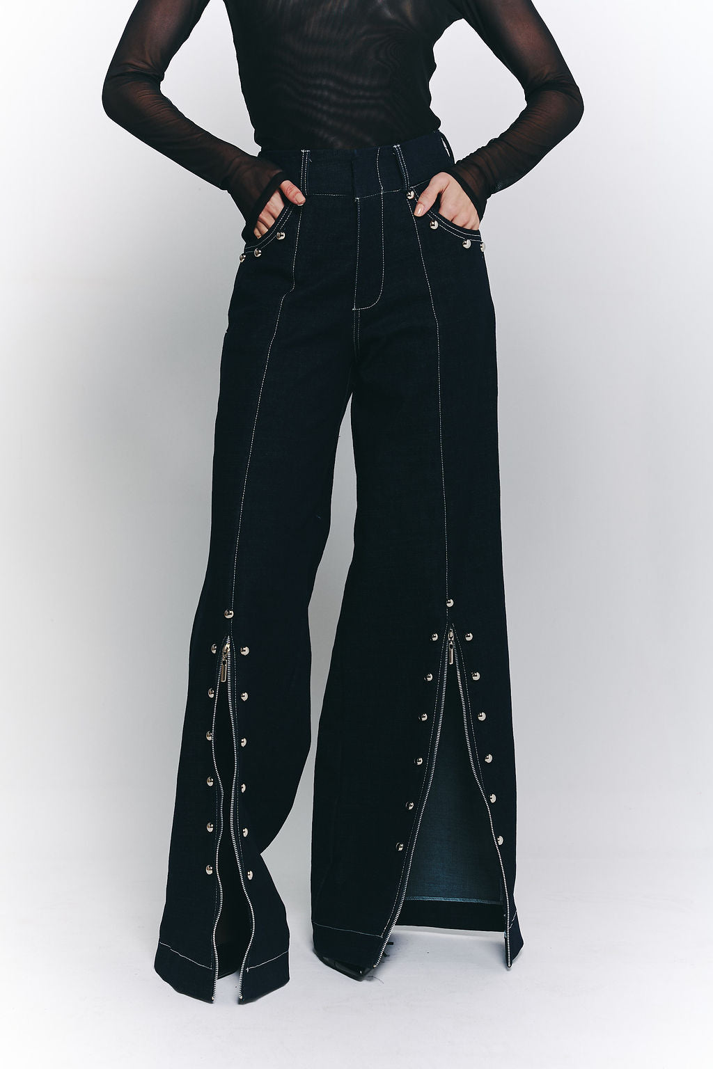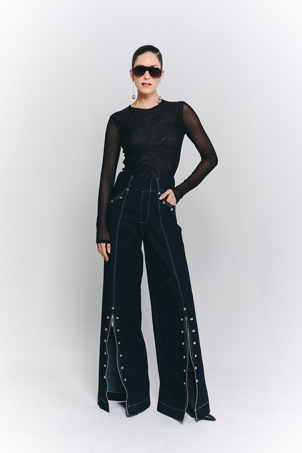 Jean en denim oscuro de tiro alto y silueta wide leg, diseñado para quienes buscan un look audaz y contemporáneo.