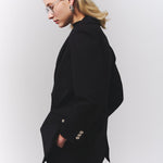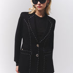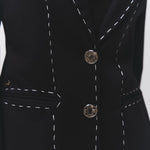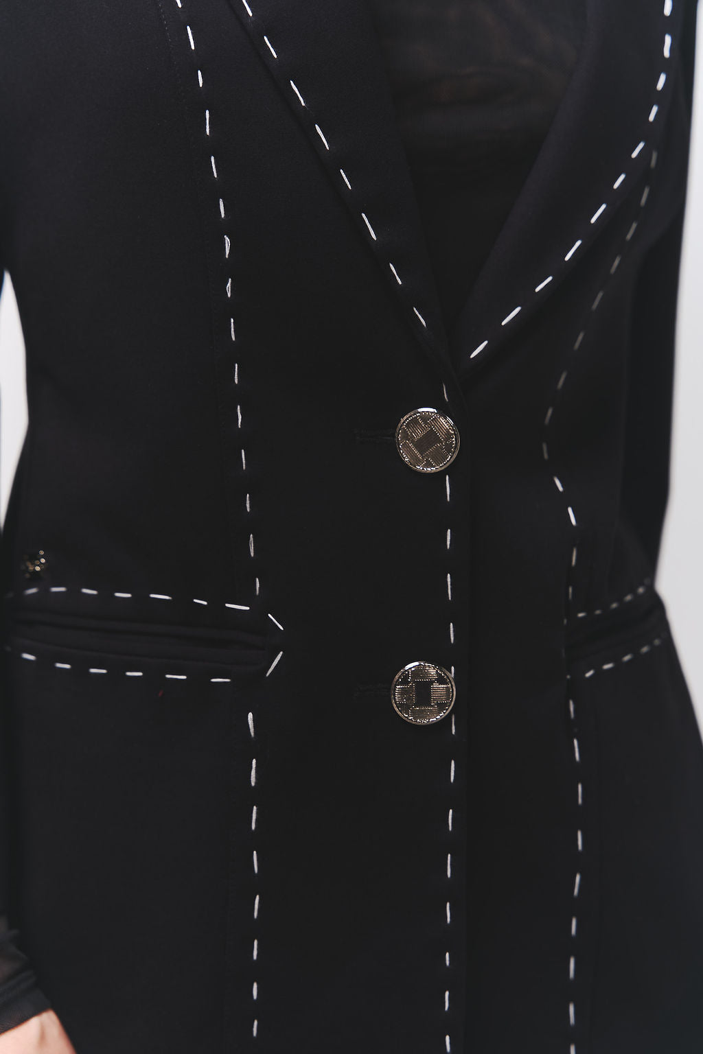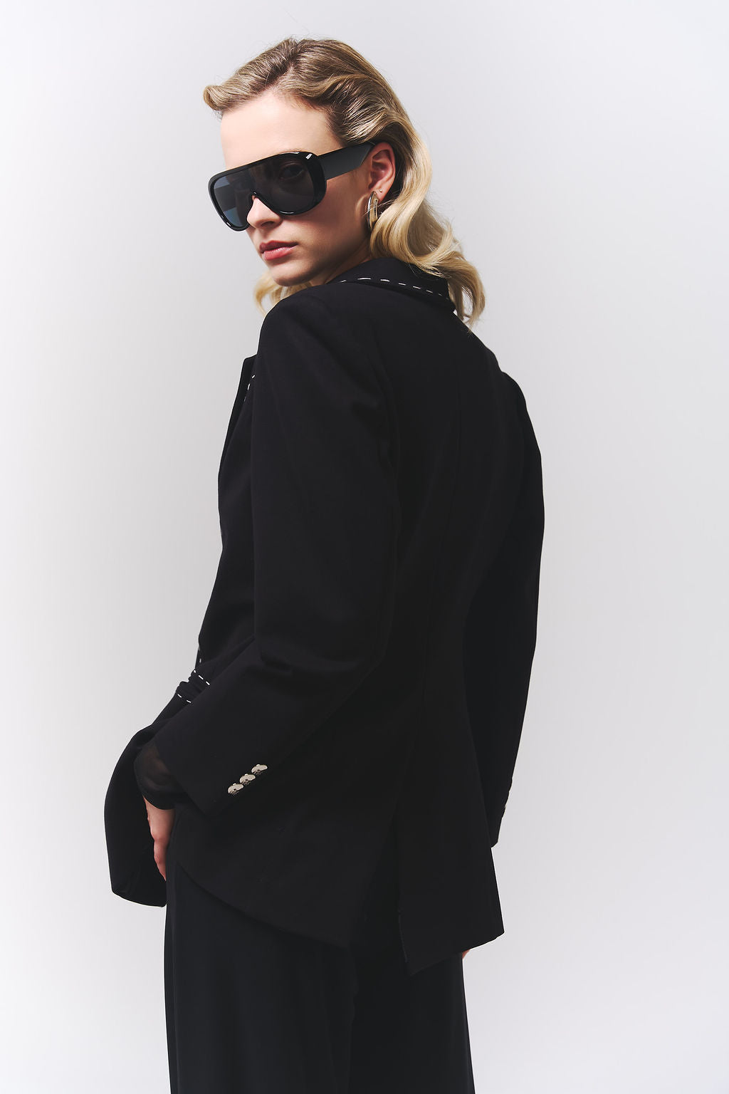 Blazer negro con pespuntes hechos a mano en color contraste, de estructura clásica que se rinde ante el movimiento.