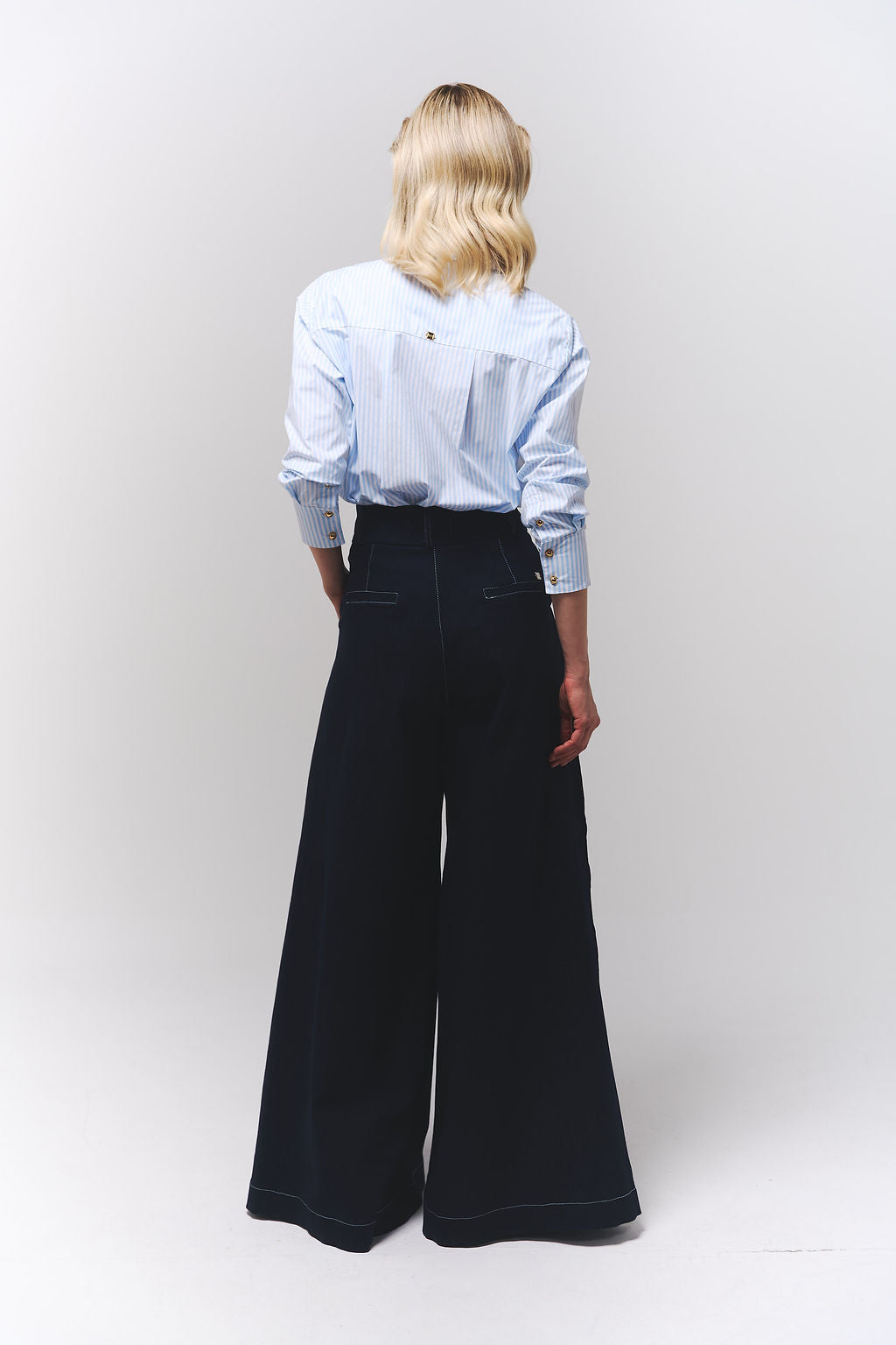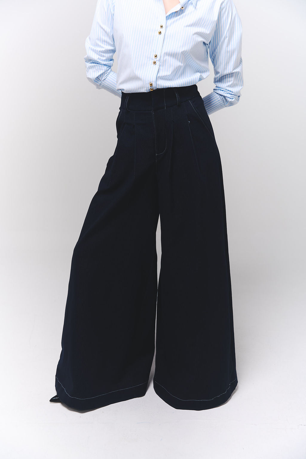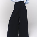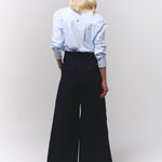 Jean en denim oscuro de tiro alto y silueta amplia con bota elefante, diseñado para quienes buscan un look audaz y contemporáneo.