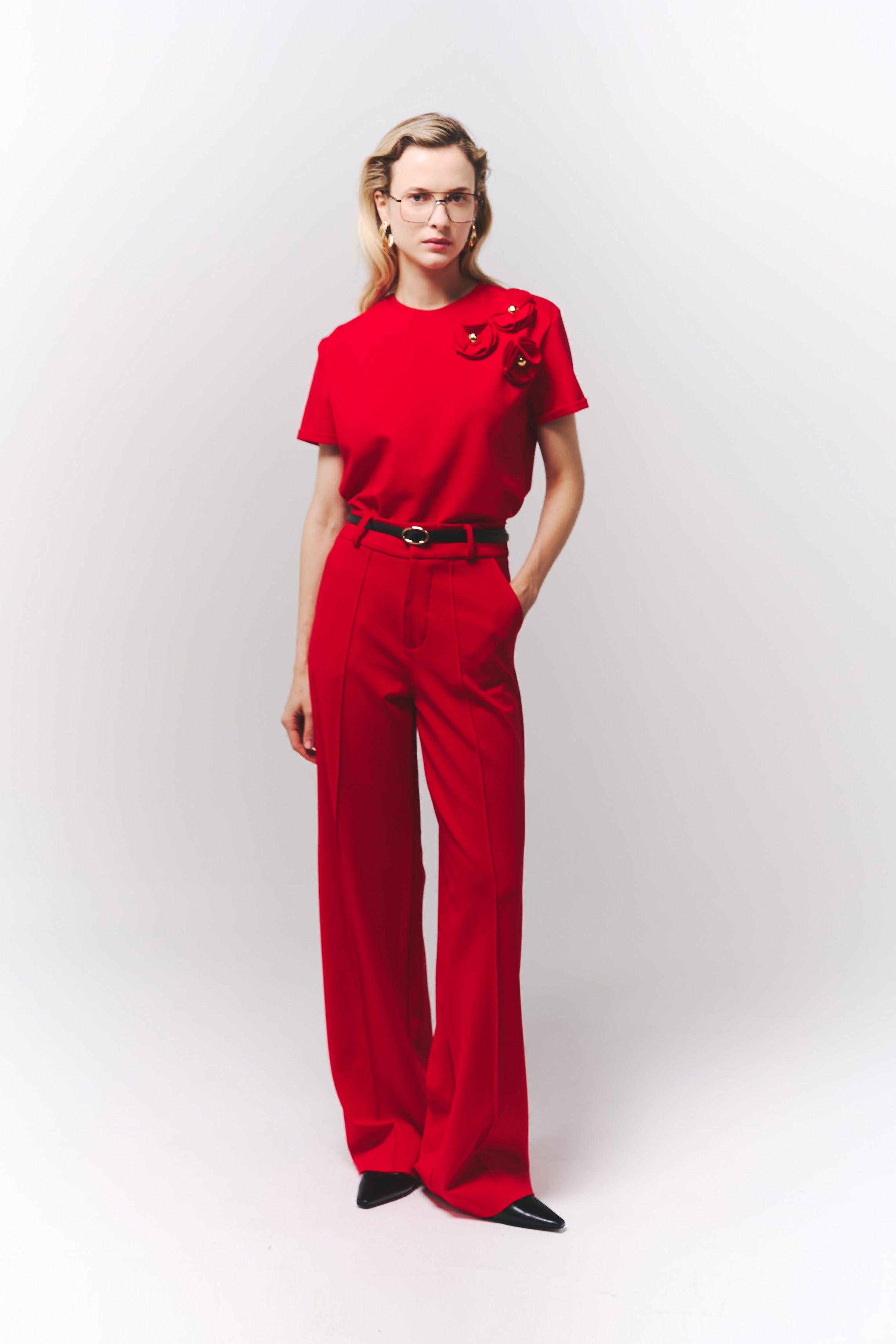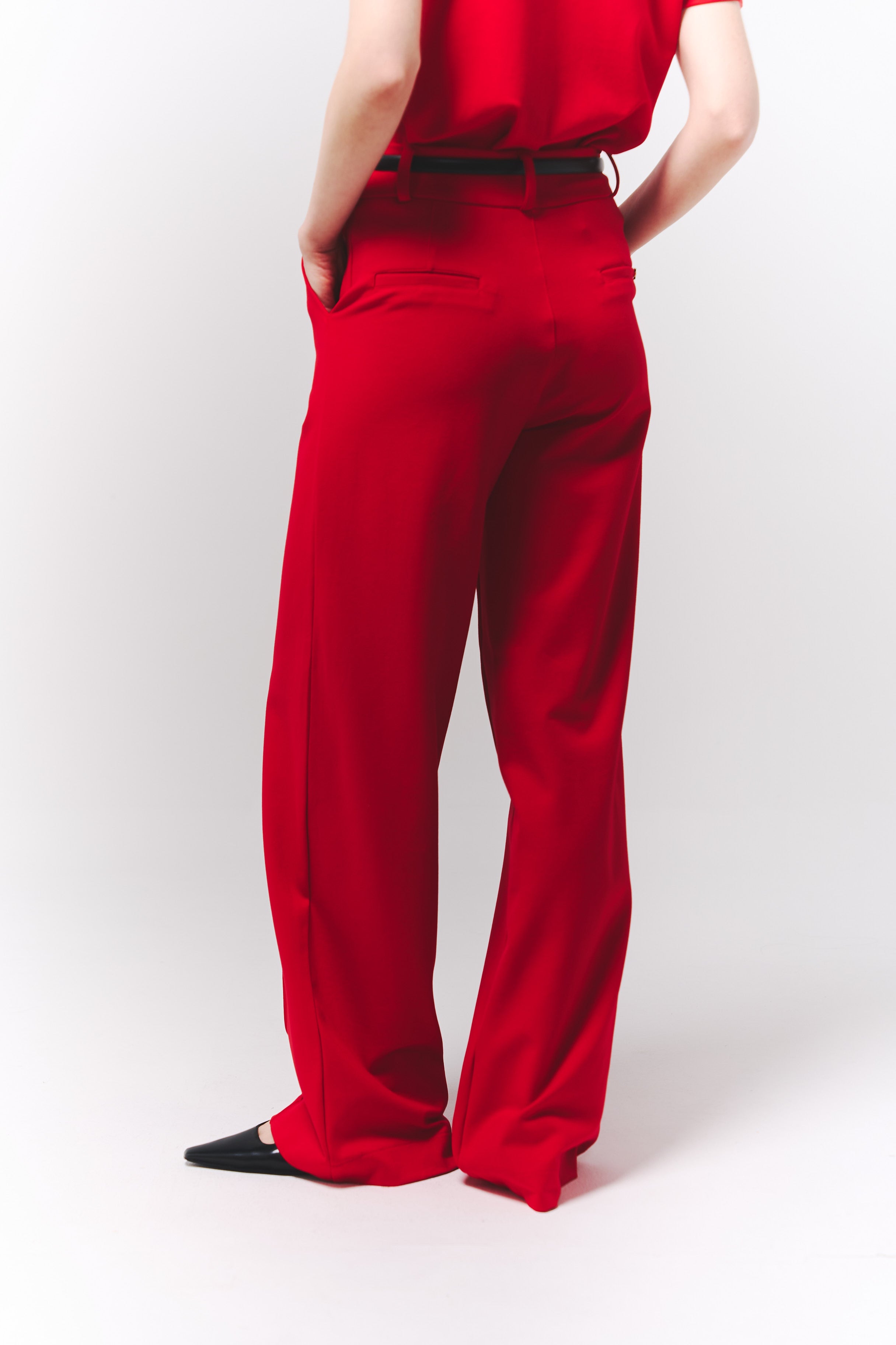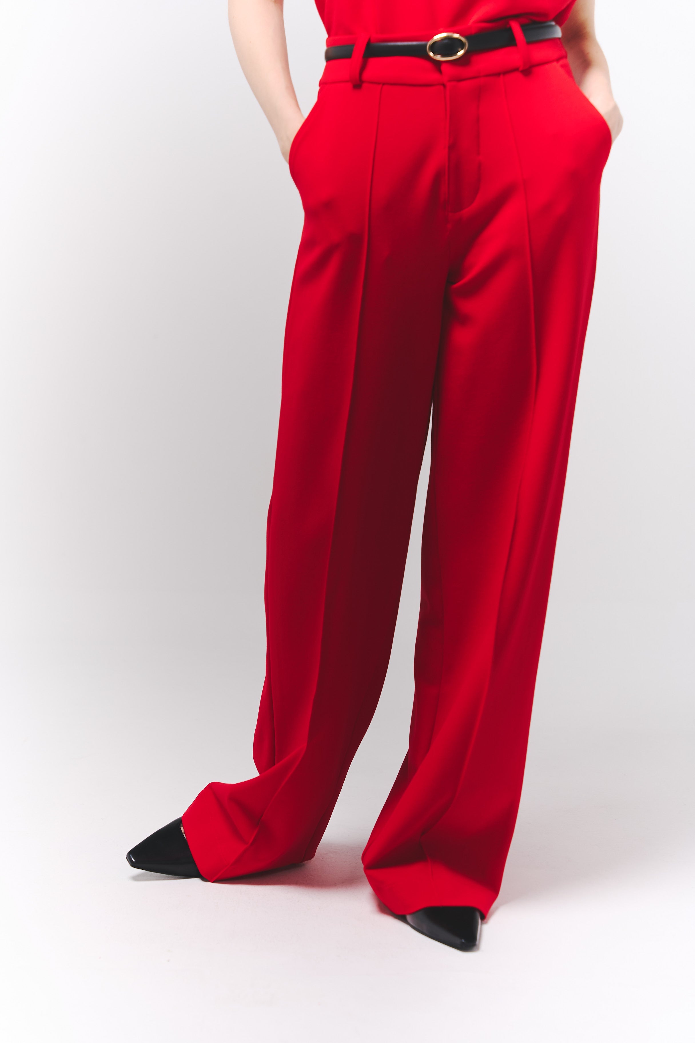 Pantalón rojo de tiro alto con caída impecable y presencia absoluta.