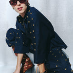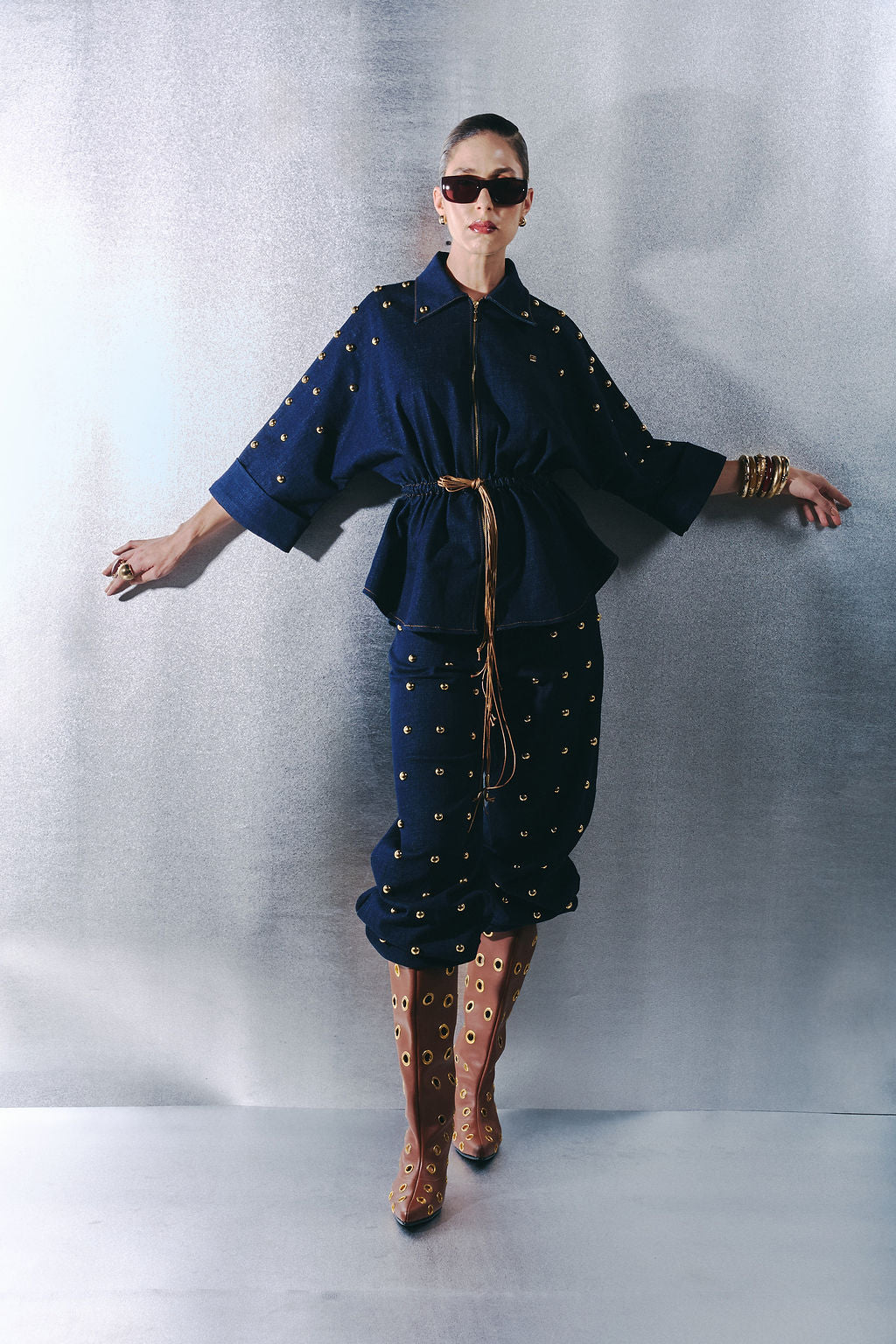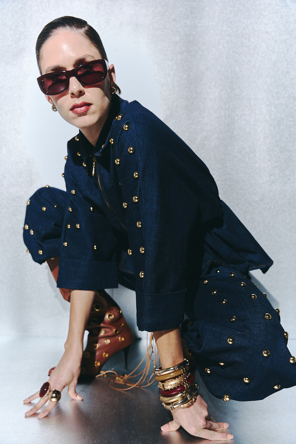 El denim se vuelve joya. Taches dorados que atrapan la luz, una silueta que respira poder y movimiento.