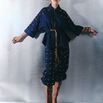 Chaqueta en denim oscuro con cierre frontal y ajuste en la cintura mediante cordón de cuero. Detalles metálicos dorados que aportan textura y brillo al look. Silueta relajada con mangas amplias con un aire effortless.