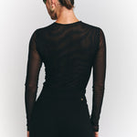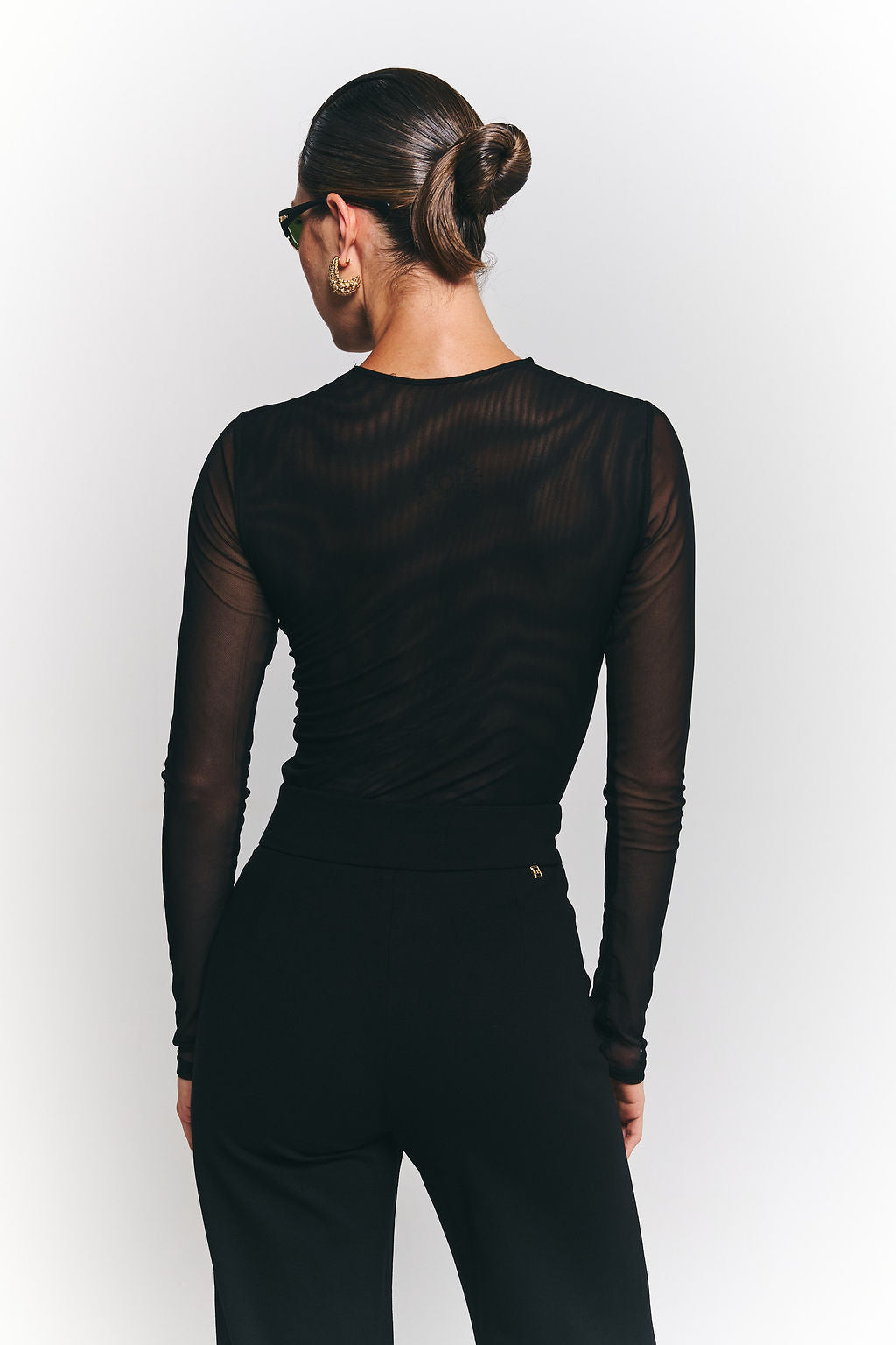 Top con manga larga y delantero doble en mesh negro ajustado al cuerpo.
